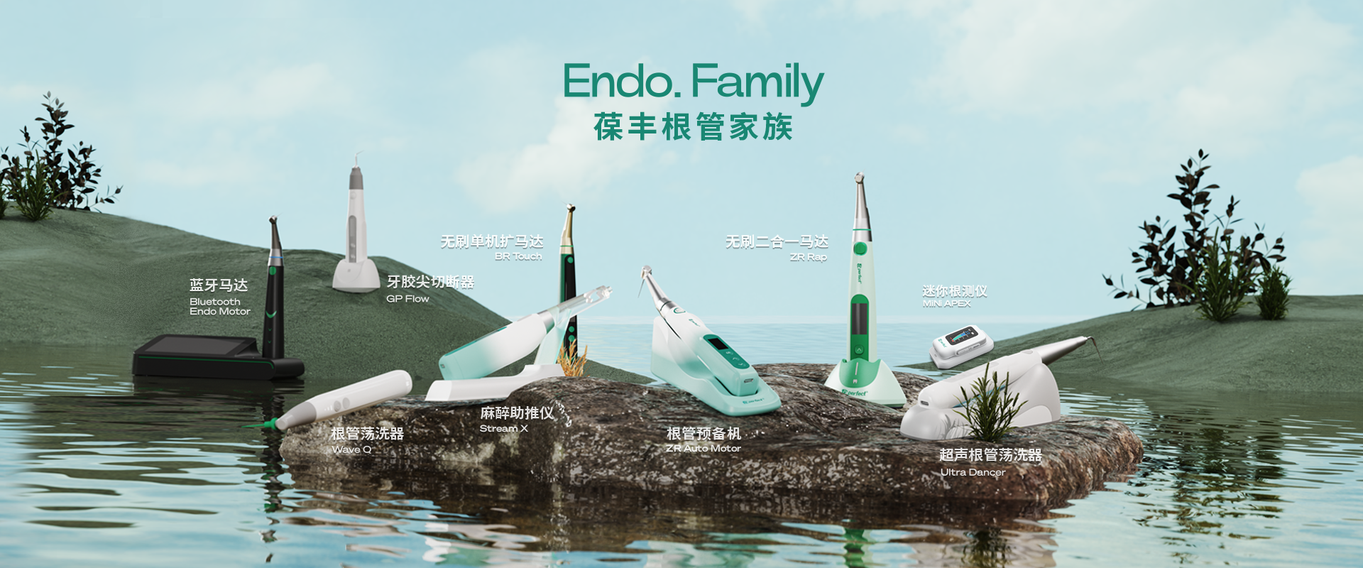 電子產品:根管預備機;根管測量儀;根管蕩洗器;熱熔牙膠充填系統;無線便攜式麻醉儀;生物陶瓷治療輔助工具。